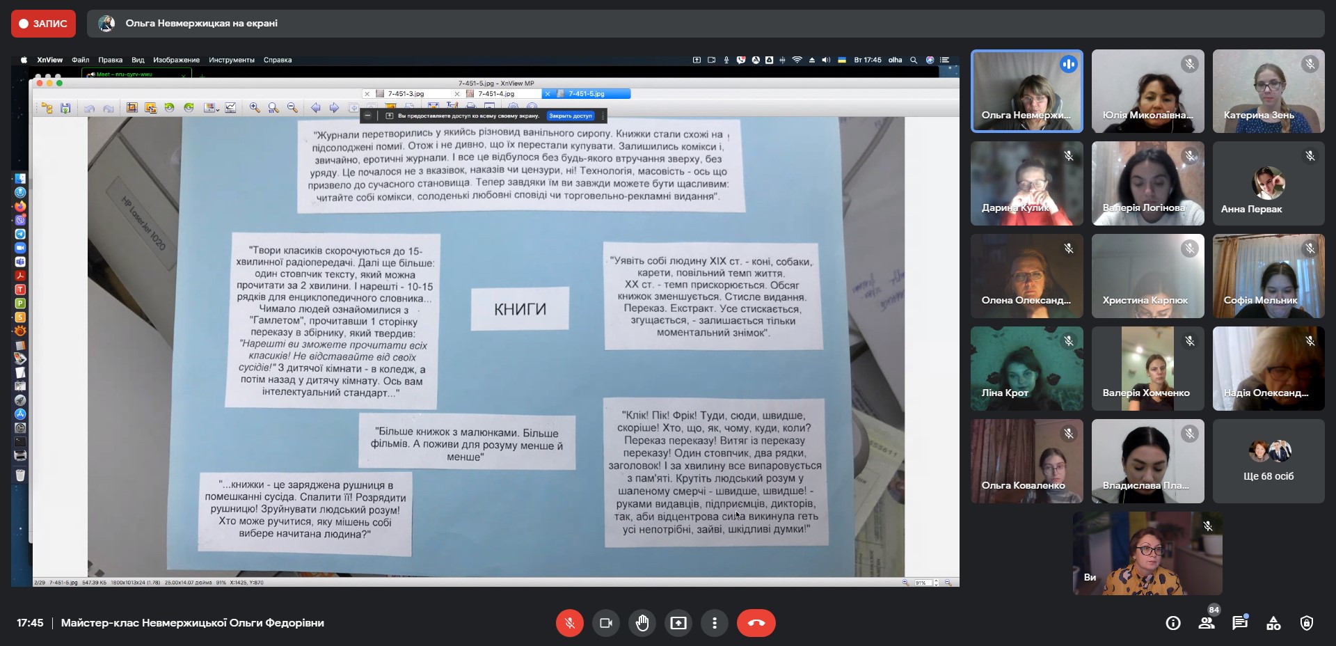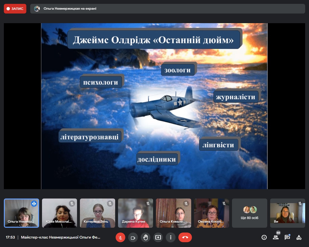 Основу зустрічі становив майстер-клас, який вчителька присвятила актуальній проблемі організації проєктної діяльності учнів у процесі вивчення зарубіжної літератури. Творчі проєкти, до створення яких педагог активно залучає своїх учнів, вона поділяє на три основні категорії: